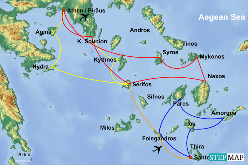 Wir bieten zwei Routen im Wechsel von der Marina Zeus in Piräus/Athen über die westlichen Kykladen nach Santorin und über die östlichen Kykladen zurück.