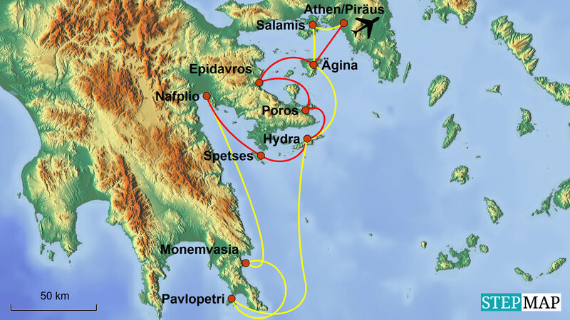 Mit Poros, Hydra und Ägina warten drei der schönsten griechischen Inseln auf Sie, mit dem antiken Theater von Epidauros eines der besterhaltenen antiken Theater in Griechenland.